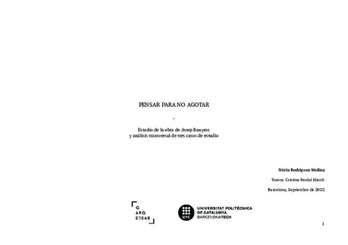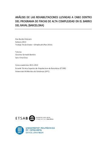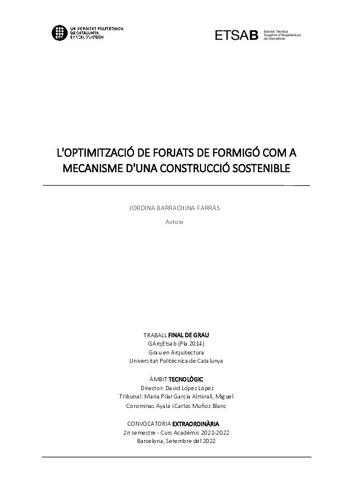 Execució i validació d'una llosa optimitzada topològicament per un algoritme Tipologías estructurales de cubiertas ligeras para cubrir grandes luces: pilares en el aire: la viga Fink La darrera estança: quatre reflexions al voltant de la peça del balcó L'optimització de forjats de formigó com a mecanisme d'una construcció sostenible Análisis de las rehabilitaciones llevadas a cabo dentro del programa de Fincas de Alta Complejidad en el barrio del Raval, Barcelona Un pati sense gènere: interseccionalitat entre arquitectura, educació i feminisme El límit en arquitectura: un estudi de les cases d'Alberto Campo Baeza De dentro hacia afuera: radiografía de un frente fluvial: Nueva York Comparació de la sostenibilitat en habitatges dels sistemes industrialitzats lleugers de fusta i acer amb els sistemes constructius convencionals: tres casos reals des de l’experiència del projecte i l’obra Privacitat a la via pública: estudi arquitectònic de l'oferta i gestió de banys públics existent al barri del Raval Disseccionant Construir con la naturaleza: el agua como infraestructura del paisaje urbano de Fez Intendente, Lisboa: reforma urbana y transformación socioeconómica Charlotte Perriand de Paris a Tokio 1955: reconstrucció de l'exposició Comprovació acústica al Teatre Metropol de Tarragona El viatge del bisbe Abraham de Suzdal i la representació de l’escenografia medieval religiosa Estrategias activas sobre el ciclo del agua en el proyecto de nuevos espacios libres en la metrópolis contemporánea Les àrees de vianants de Barcelona: una anàlisi de les característiques de la xarxa Estudi de la sala de calderes de Fabra i Coats: captura massiva de dades i aproximació metodològica per al modelat HBIM mitjançant l'estructura IFC Entre espais: estudi dels espais intermedis en projectes d'habitatge col·lectiu La no-ruina futura: el carácter infraestructural de la arquitectura Subversión del arquetipo: estudio sintáctico de la obra de Valerio Olgiati y Peter Märkli Atmósferas en el tiempo El desarrollo de la arquitectura del sol en Mallorca Copy & Paste: replicar, re-usar y re-apropiar Dehors en Milán: 70 miradas a la ciudad deshabitada Evaluación de los espacios urbanos en el contexto de los conciertos callejeros en el Barrio Gótico de Barcelona Arquitectura no construida: representar la ciudad percibida, concebida y vivida From analog to digital: study of Frei Otto's experimental models Berlín, l'apropiació com a mecanisme identitari Pensar para no agotar: estudio de la evolución de la obra de Josep Bunyesc y análisis transversal de tres casos de estudio Estudi comparatiu sobre la sostenibilitat de les estructures de fusta contralaminada A través del porche: comparativa de siete obras a escala Quatre fragments, una ciutat: una lectura històrica de Cagliari La plaza como imaginación colectiva: lecciones de Trinitate Plaza de Luis Peña Ganchegui y Piazza Sebastiano Satta de Costantino Nivola Investigació i participació en el procés de recuperar un equipament patrimonial: el Taller Masriera Hassan Fathy: arquitectura de la dignidad La càpsula Kurokawa: l'arquitectura càpsula com a resposta davant la crisi habitacional al Japó Estudio del patrimonio arquitectónico industrial vinculado al sector conservero en Vigo Bibliotecas en el patrimonio industrial de Barcelona: la transformación de enclaves urbanos